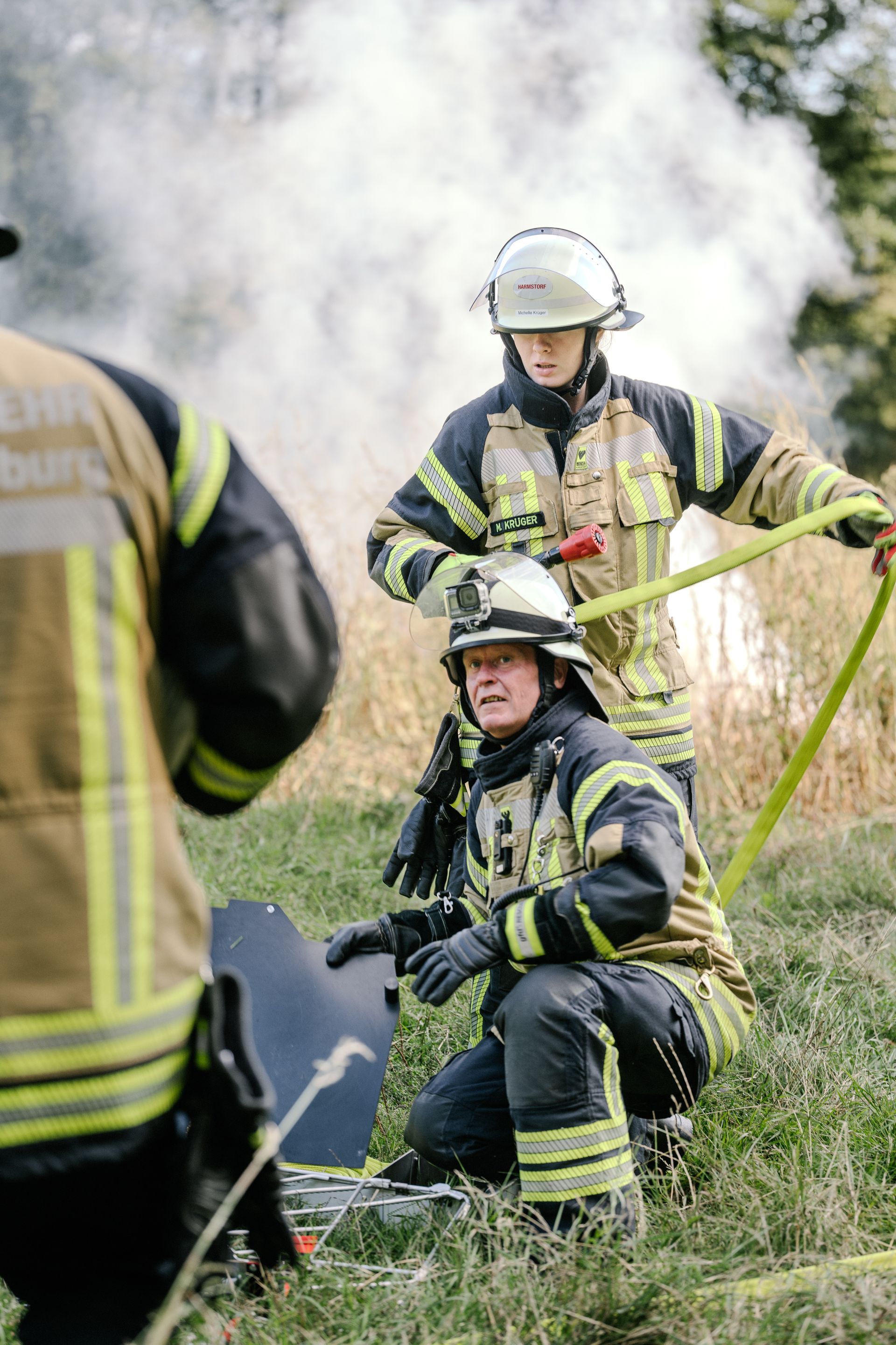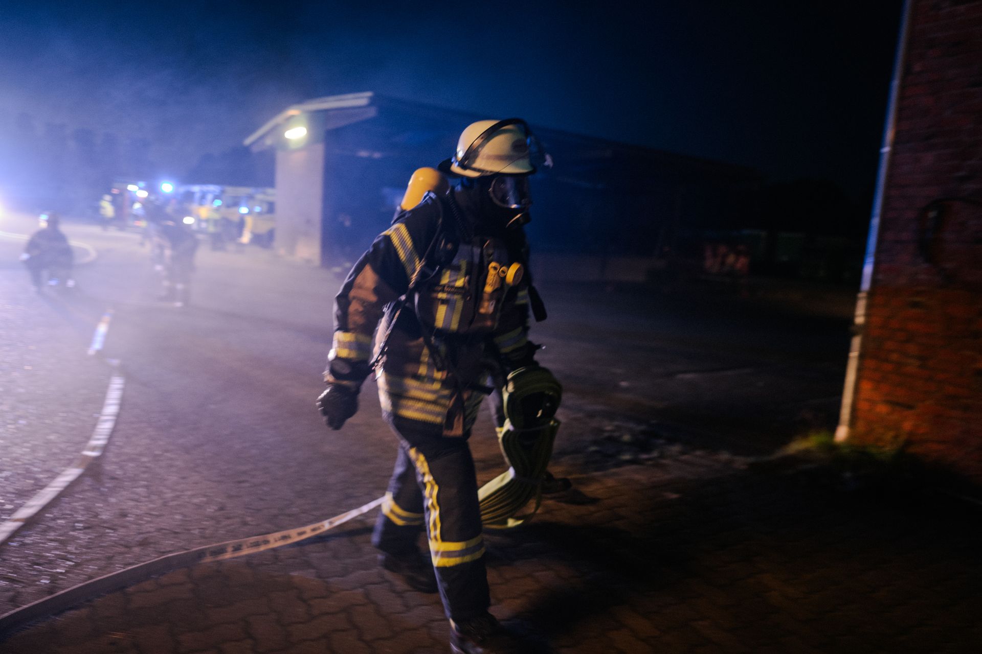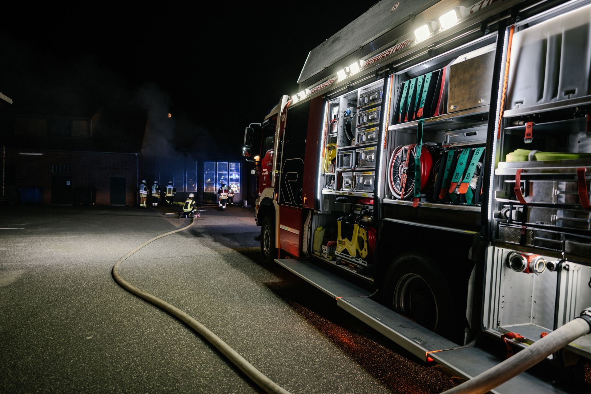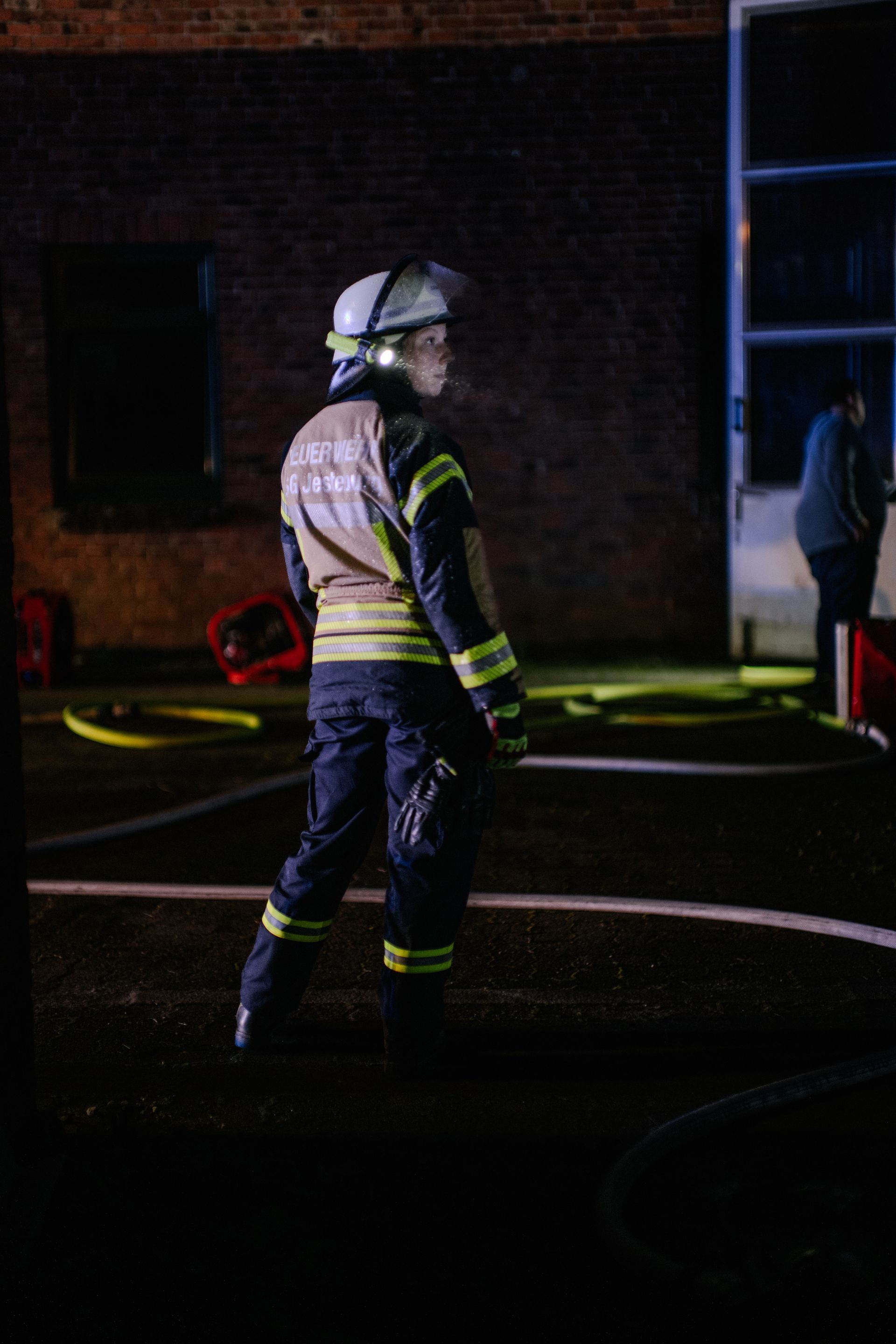 Für die Abschlussübung ging es nach Harmstorf. Dort kam es nach Trennschleifarbeiten zu einem Feuer in einer Werkstatt. Nach ersten Löschversuchen wurde ein Mitarbeiter vermisst. Im Verlauf stellte sich heraus, dass durch fehlenden baulichen Brandschutz eine Rauchausbreitung in die darüberliegende Wohnung stattgefunden hat. Dort wurden zwei Personen vermisst. Auch dieses Szenario konnte unter Leitung des stellvertretenden Gemeindebrandmeisters erfolgreich bearbeitet werden. Hier waren eine gute Ordnung des Raumes, eine Umfassende Erkundung, sowie eine frühzeitige Abschnittsbildung Schlüssel zum Erfolg.