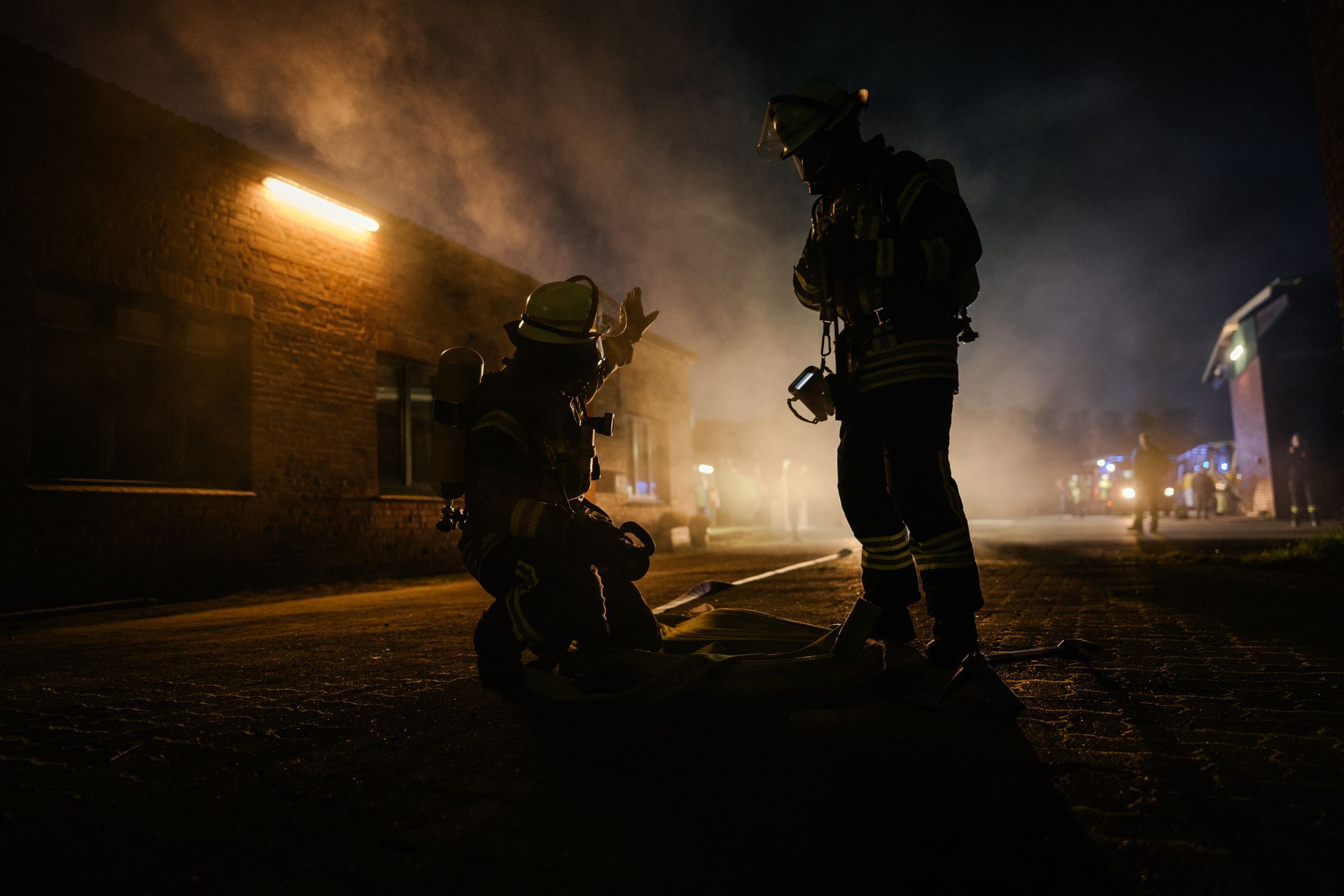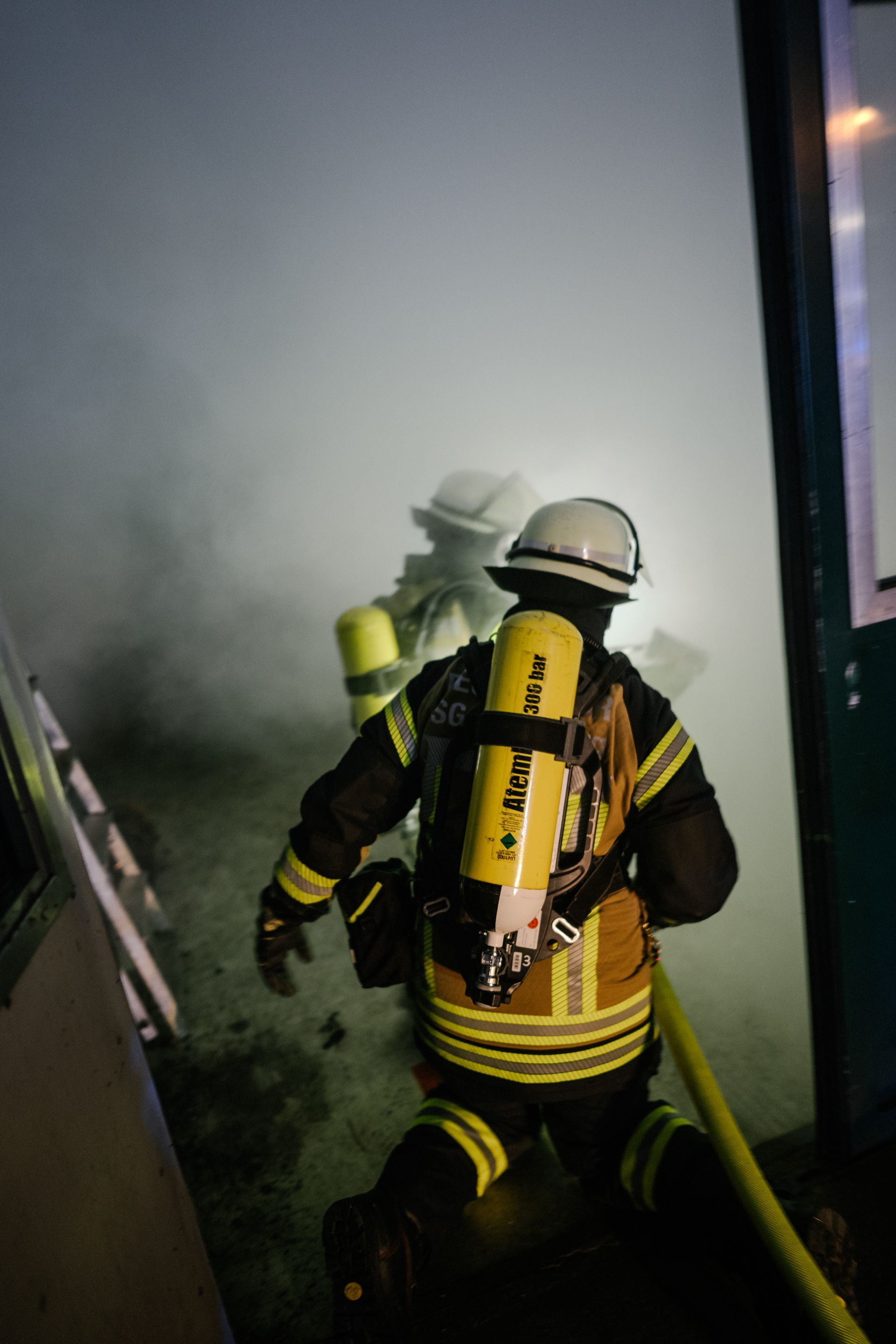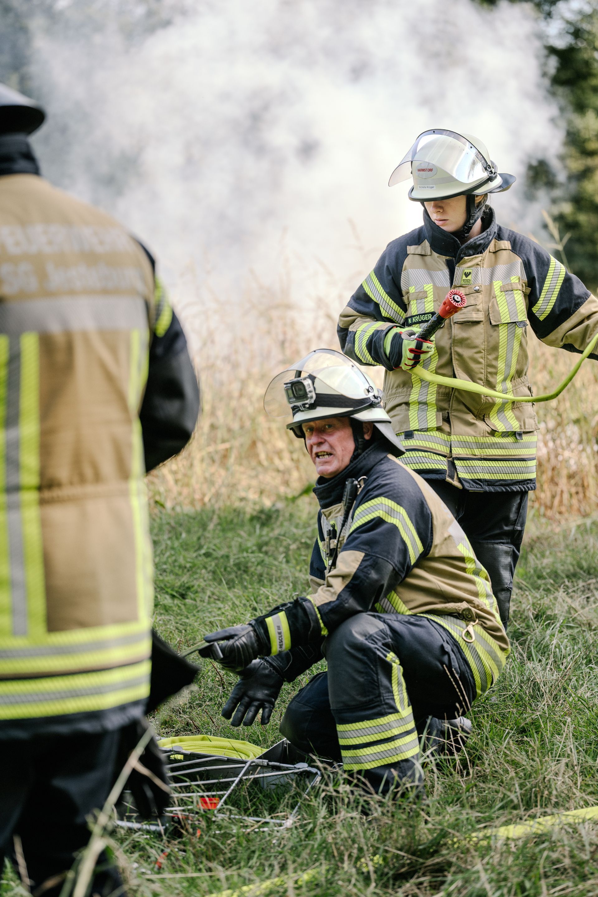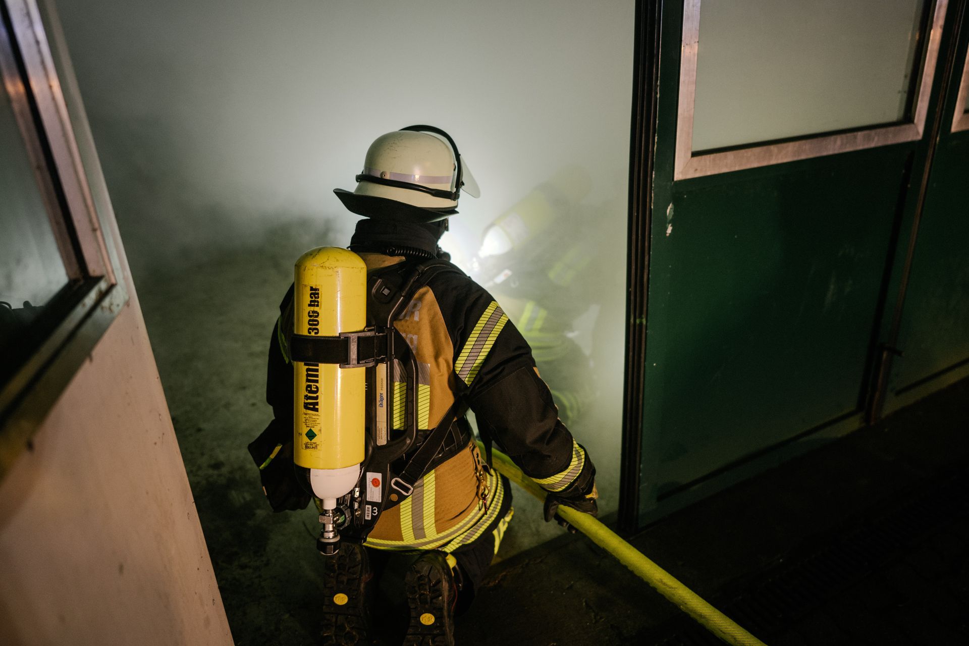 Für die Abschlussübung ging es nach Harmstorf. Dort kam es nach Trennschleifarbeiten zu einem Feuer in einer Werkstatt. Nach ersten Löschversuchen wurde ein Mitarbeiter vermisst. Im Verlauf stellte sich heraus, dass durch fehlenden baulichen Brandschutz eine Rauchausbreitung in die darüberliegende Wohnung stattgefunden hat. Dort wurden zwei Personen vermisst. Auch dieses Szenario konnte unter Leitung des stellvertretenden Gemeindebrandmeisters erfolgreich bearbeitet werden. Hier waren eine gute Ordnung des Raumes, eine Umfassende Erkundung, sowie eine frühzeitige Abschnittsbildung Schlüssel zum Erfolg.