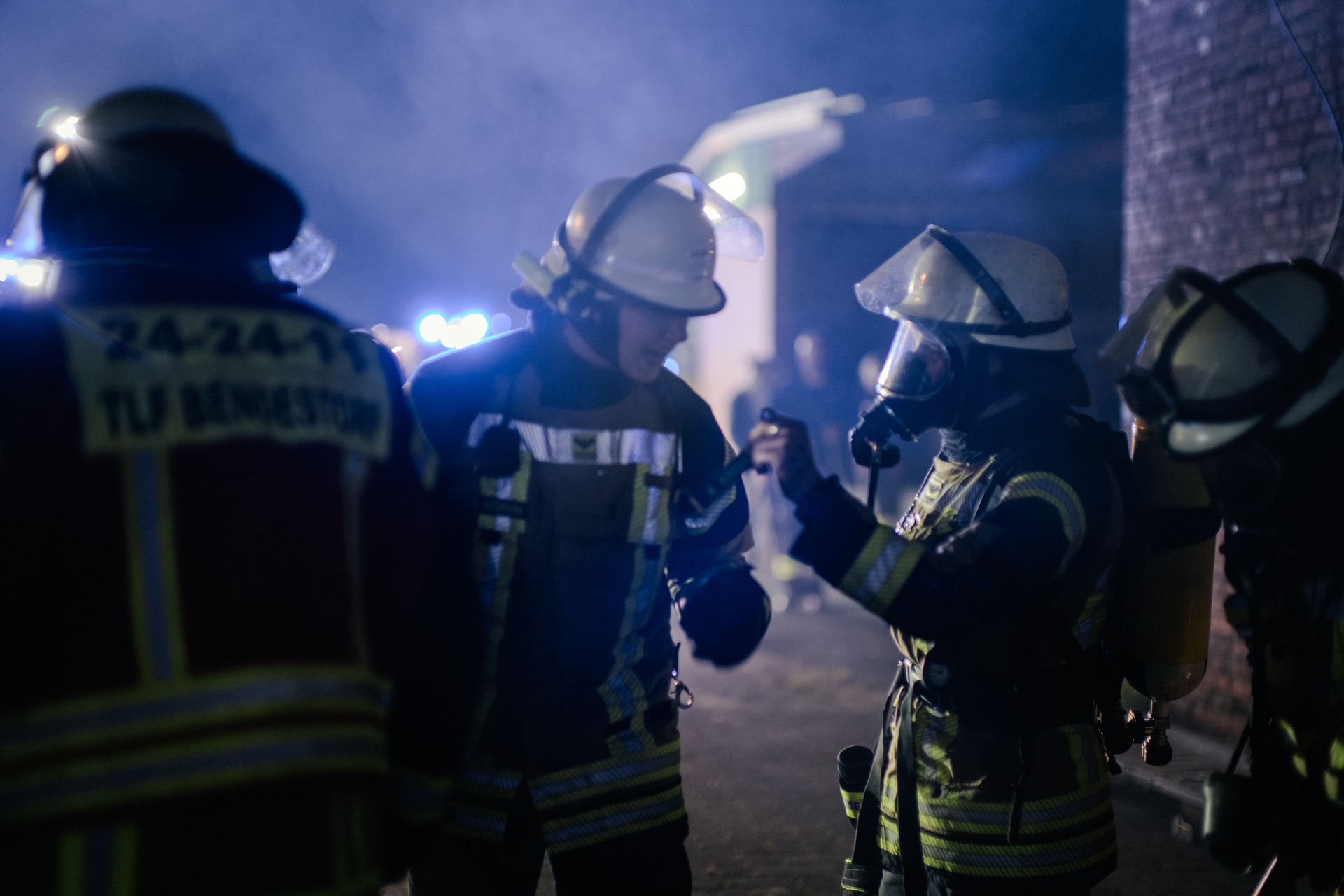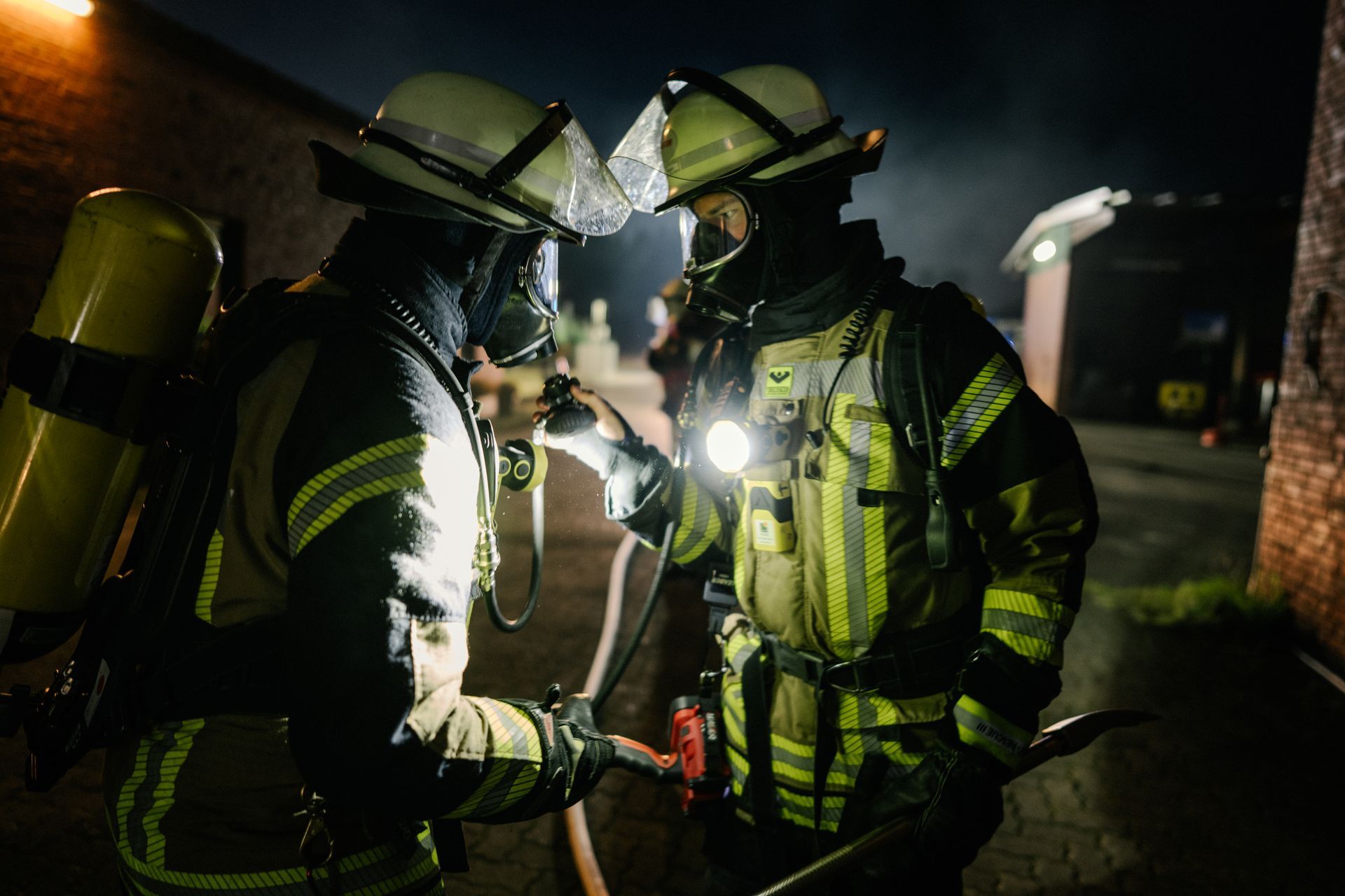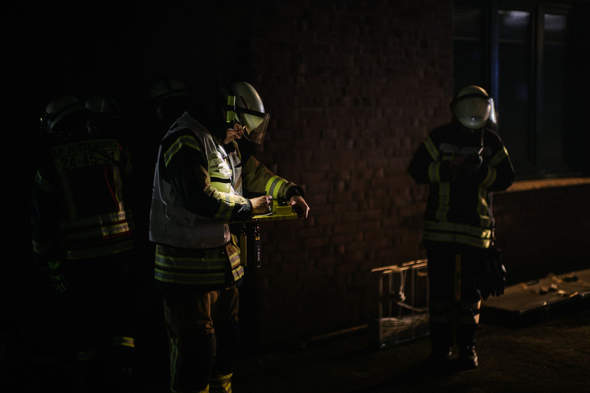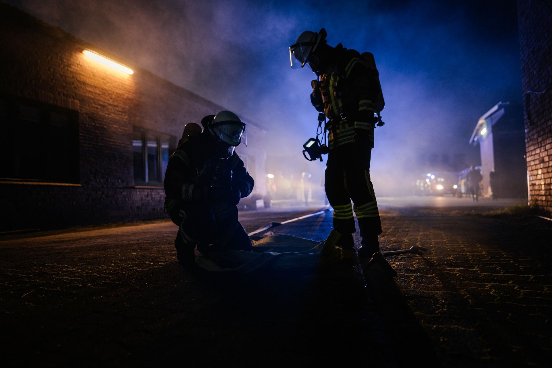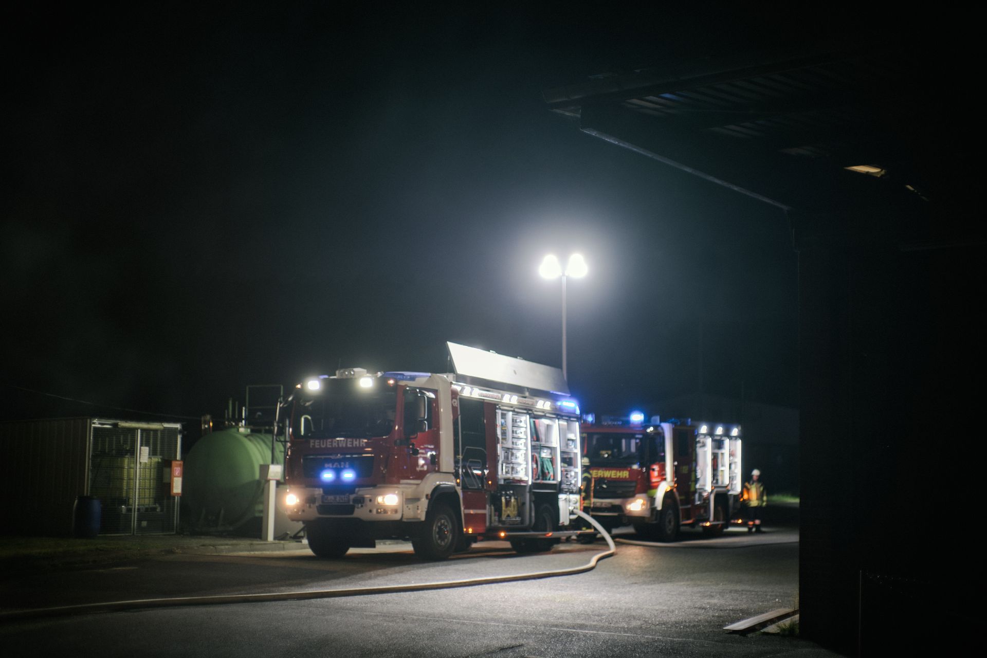 Für die Abschlussübung ging es nach Harmstorf. Dort kam es nach Trennschleifarbeiten zu einem Feuer in einer Werkstatt. Nach ersten Löschversuchen wurde ein Mitarbeiter vermisst. Im Verlauf stellte sich heraus, dass durch fehlenden baulichen Brandschutz eine Rauchausbreitung in die darüberliegende Wohnung stattgefunden hat. Dort wurden zwei Personen vermisst. Auch dieses Szenario konnte unter Leitung des stellvertretenden Gemeindebrandmeisters erfolgreich bearbeitet werden. Hier waren eine gute Ordnung des Raumes, eine Umfassende Erkundung, sowie eine frühzeitige Abschnittsbildung Schlüssel zum Erfolg.