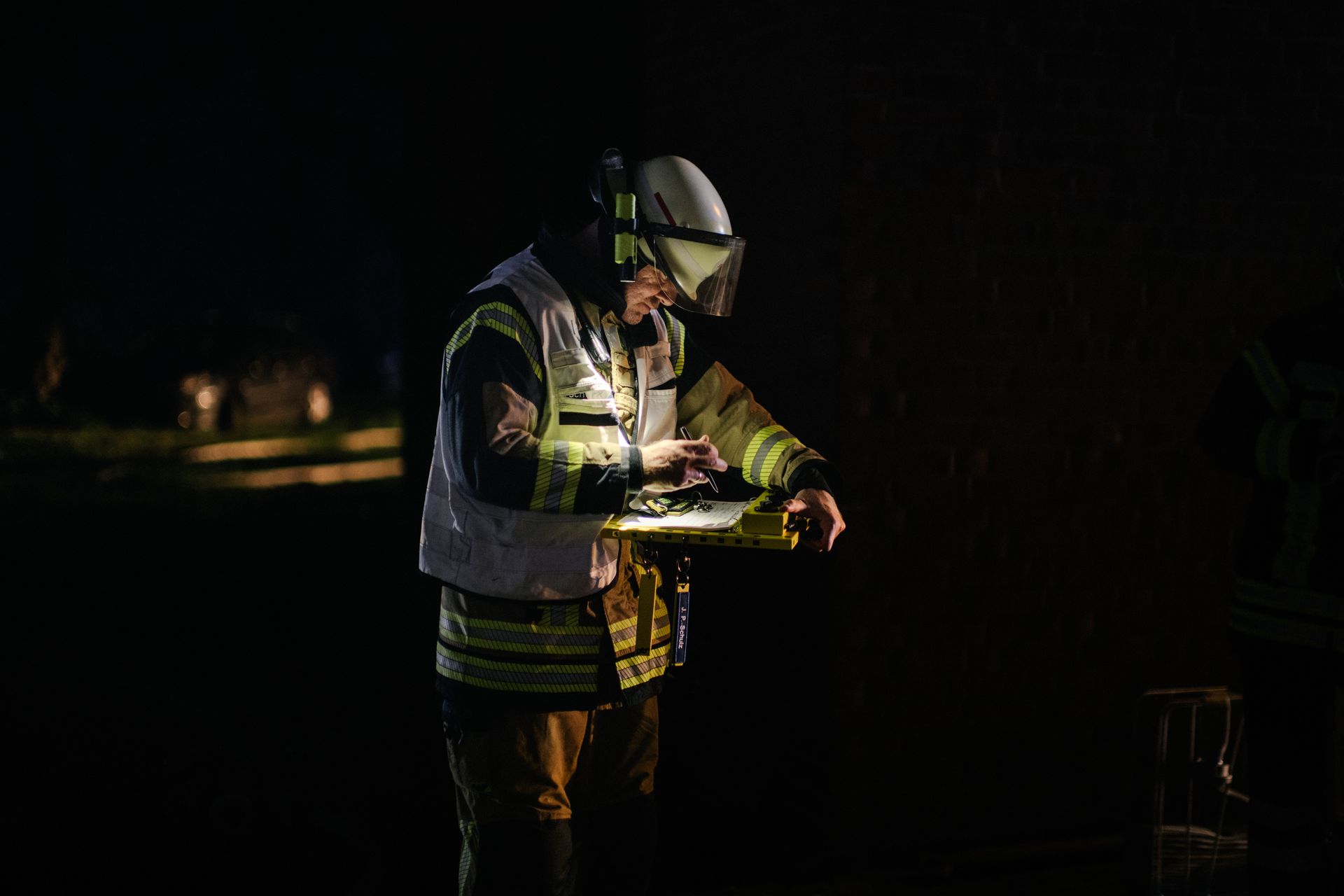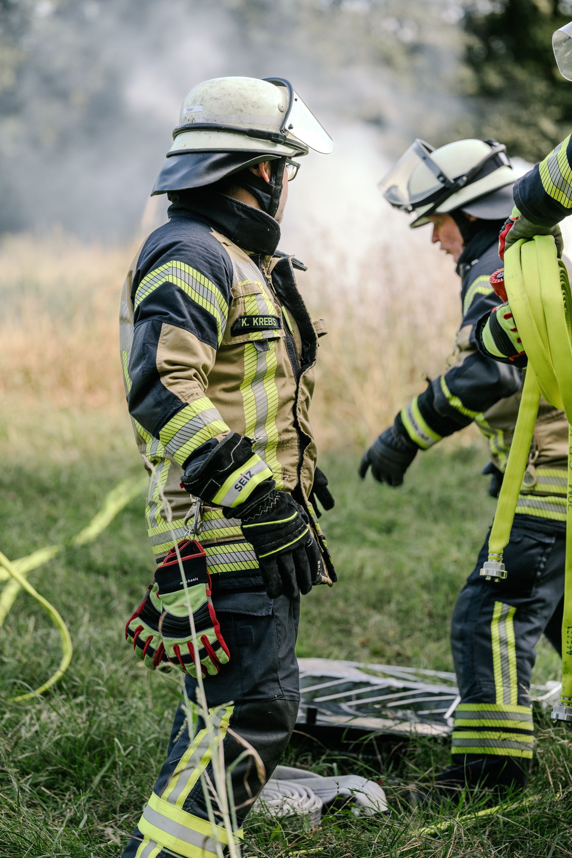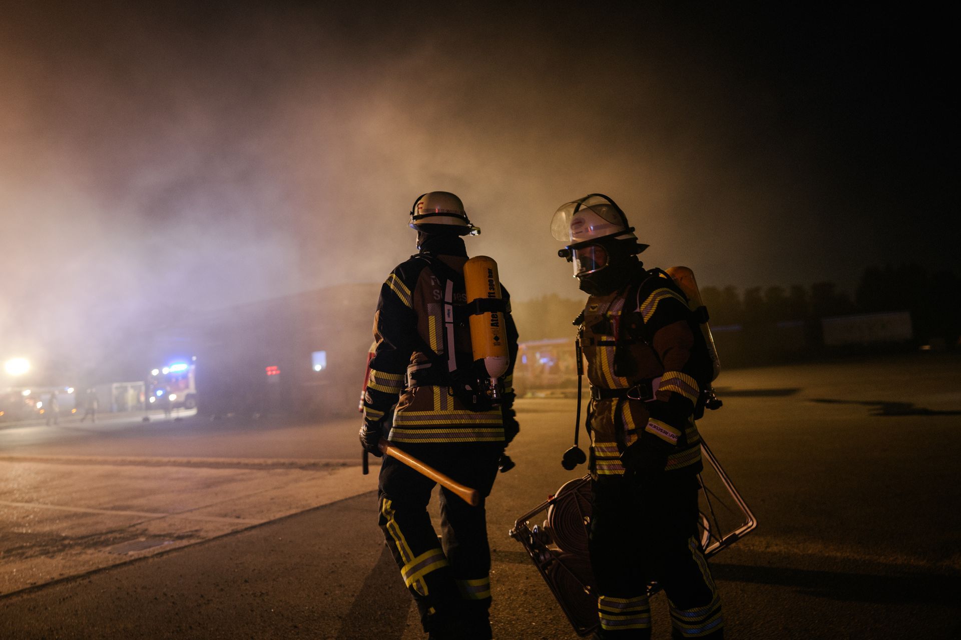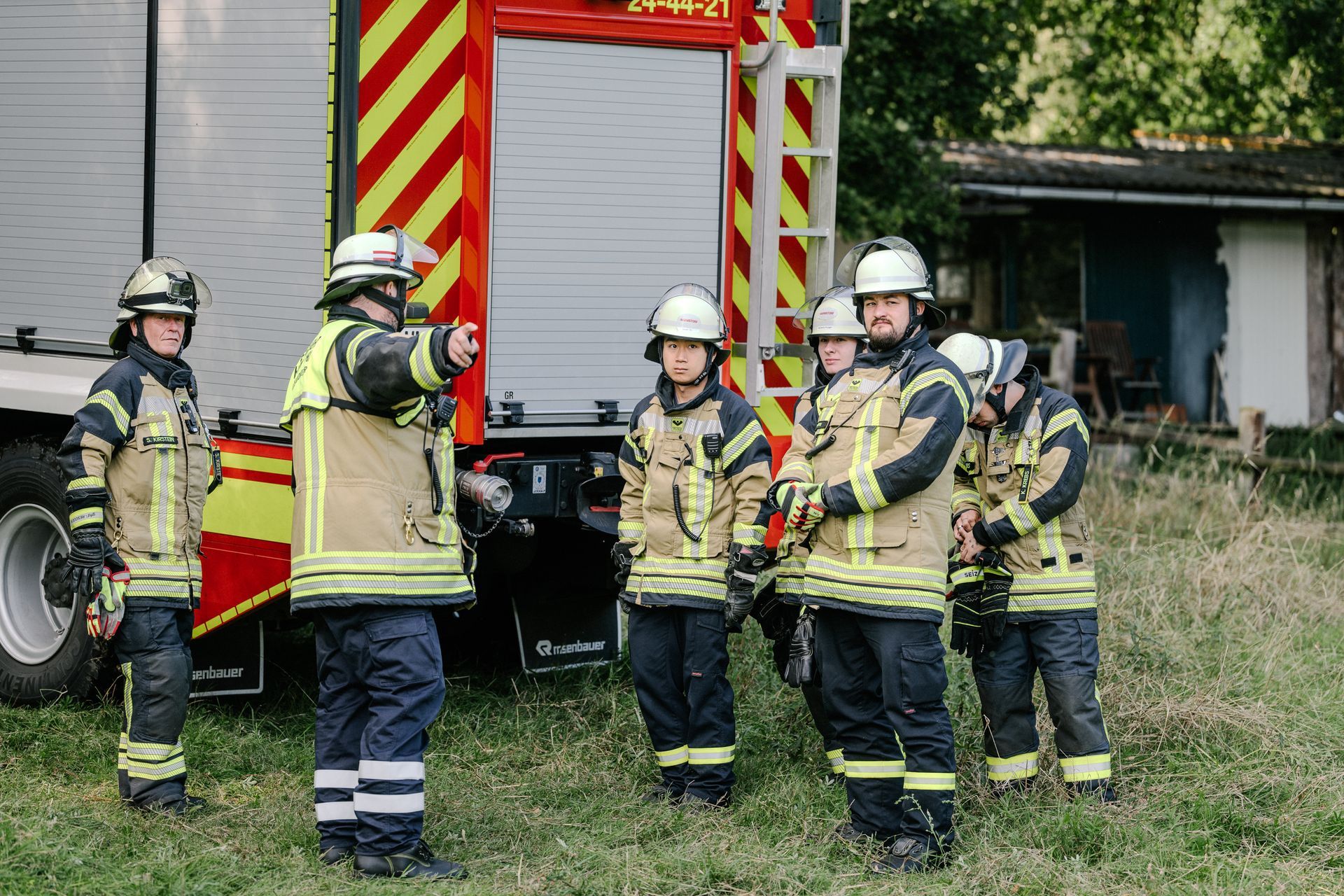 Für die Abschlussübung ging es nach Harmstorf. Dort kam es nach Trennschleifarbeiten zu einem Feuer in einer Werkstatt. Nach ersten Löschversuchen wurde ein Mitarbeiter vermisst. Im Verlauf stellte sich heraus, dass durch fehlenden baulichen Brandschutz eine Rauchausbreitung in die darüberliegende Wohnung stattgefunden hat. Dort wurden zwei Personen vermisst. Auch dieses Szenario konnte unter Leitung des stellvertretenden Gemeindebrandmeisters erfolgreich bearbeitet werden. Hier waren eine gute Ordnung des Raumes, eine Umfassende Erkundung, sowie eine frühzeitige Abschnittsbildung Schlüssel zum Erfolg.