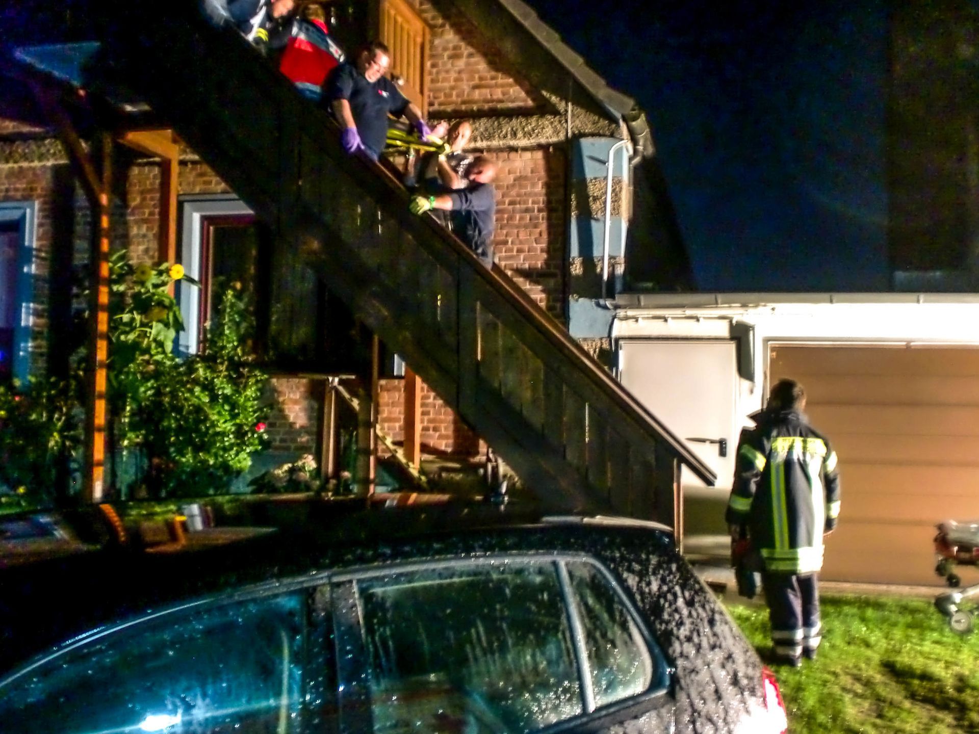 Abend des 10.09.2014 gegen 20:37 wurde die Feuerwehr Bendestorf zur Unterstützung des Rettungsdienstes gerufen. Eine Person musste über die Außentreppe des Gebäudes in den RTW getragen werden, da die Treppe zu schmal und steil für den Rettungsdienst allein gewesen ist. Nachdem die Person transportfähig gewesen ist, wurde sie mittels des Spineboardes der Feuerwehr Bendestorf zum RTW getragen. Für die Ausleuchtung der Einsatzstelle wurden Scheinwerfer aufgestellt.