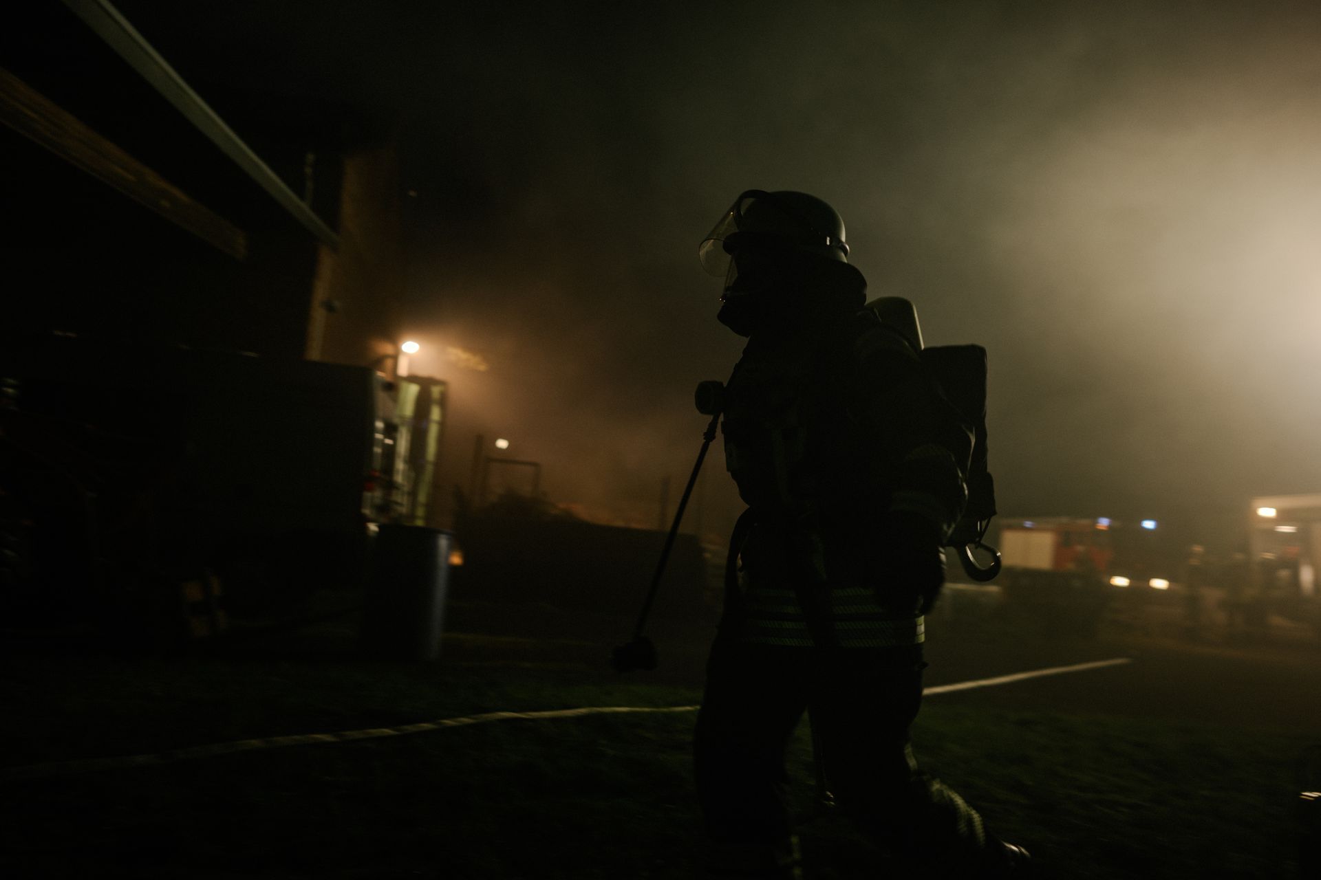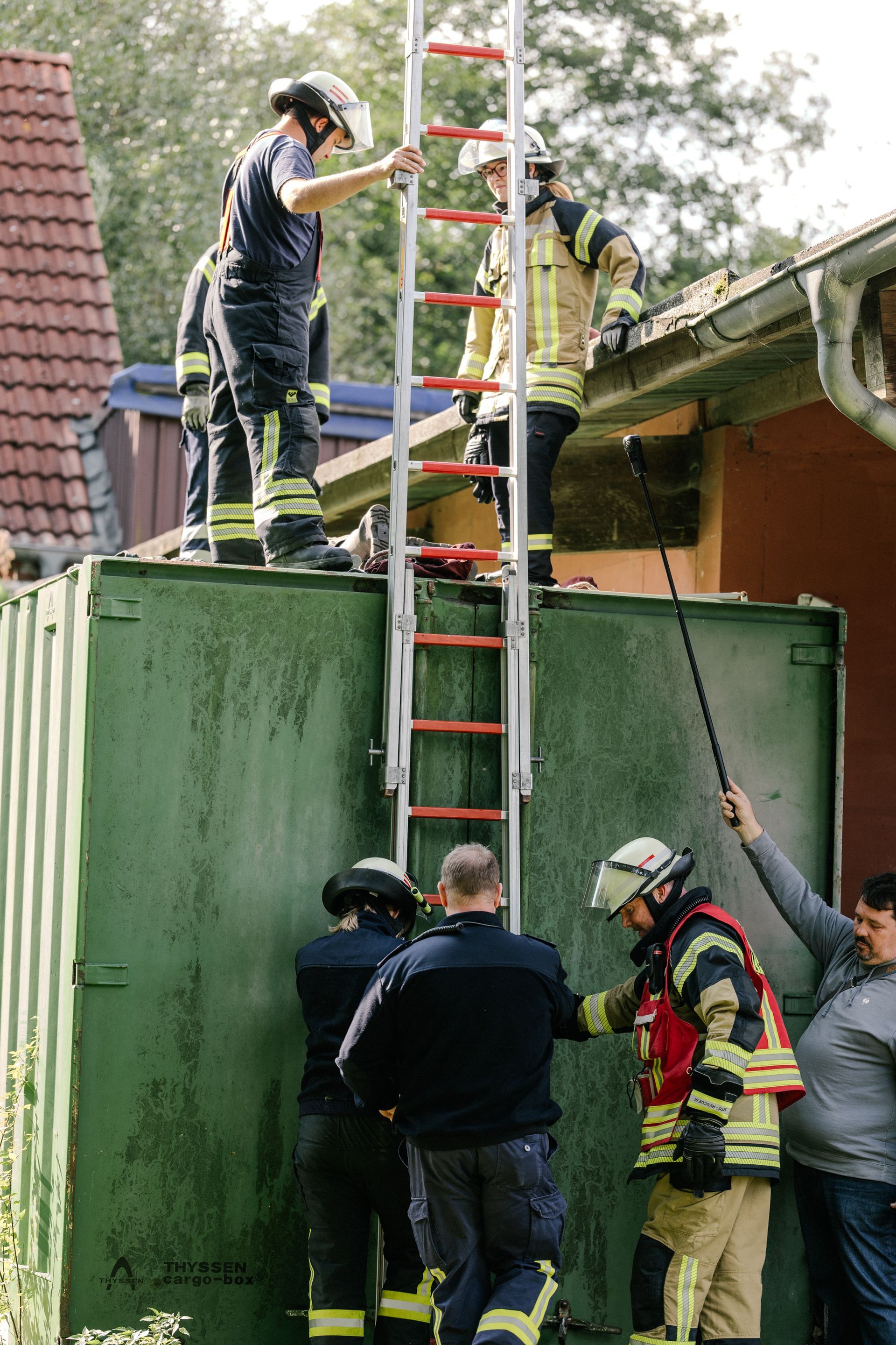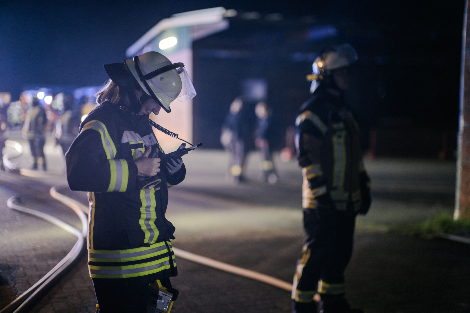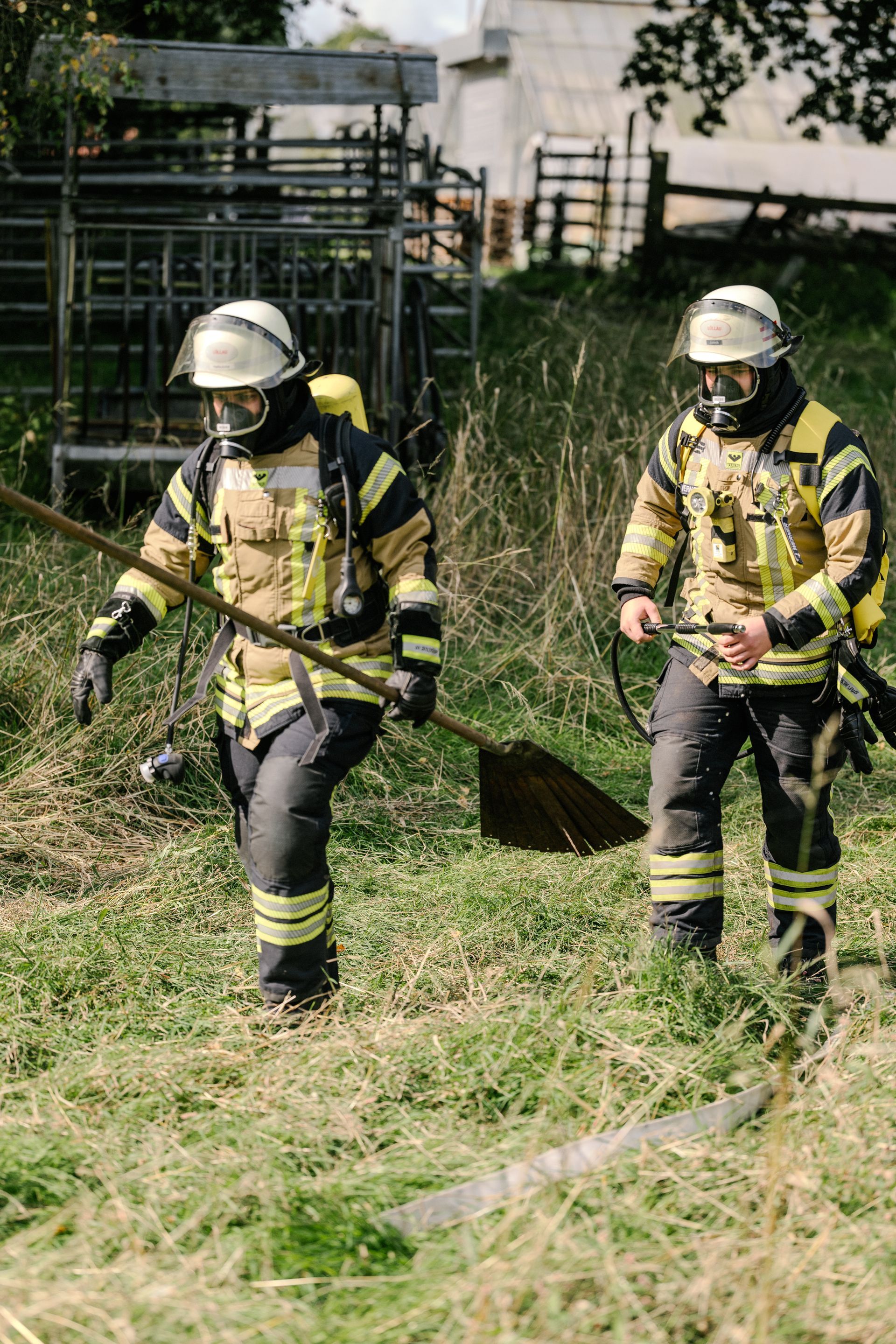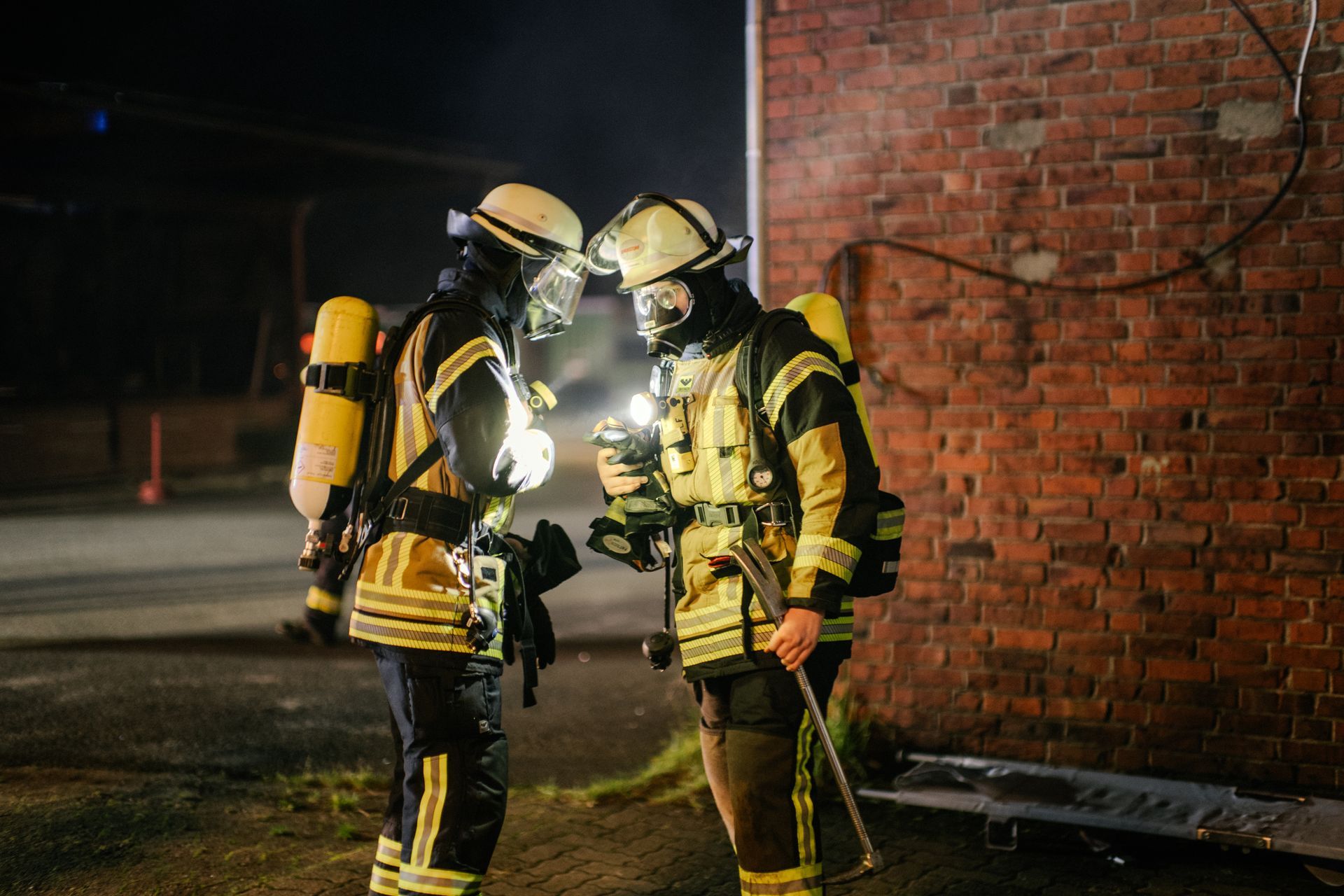 Für die Abschlussübung ging es nach Harmstorf. Dort kam es nach Trennschleifarbeiten zu einem Feuer in einer Werkstatt. Nach ersten Löschversuchen wurde ein Mitarbeiter vermisst. Im Verlauf stellte sich heraus, dass durch fehlenden baulichen Brandschutz eine Rauchausbreitung in die darüberliegende Wohnung stattgefunden hat. Dort wurden zwei Personen vermisst. Auch dieses Szenario konnte unter Leitung des stellvertretenden Gemeindebrandmeisters erfolgreich bearbeitet werden. Hier waren eine gute Ordnung des Raumes, eine Umfassende Erkundung, sowie eine frühzeitige Abschnittsbildung Schlüssel zum Erfolg.