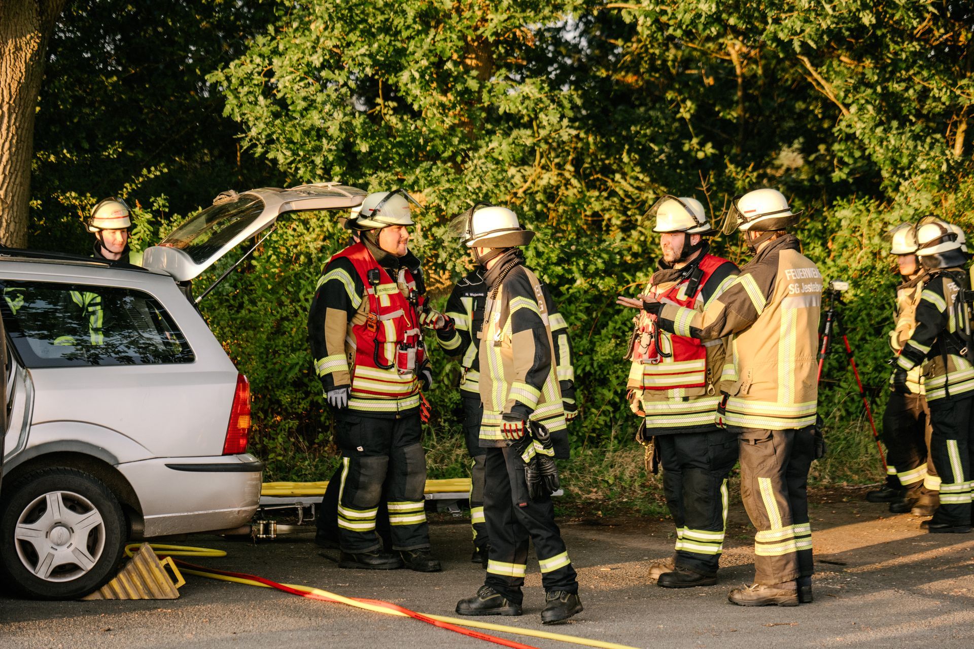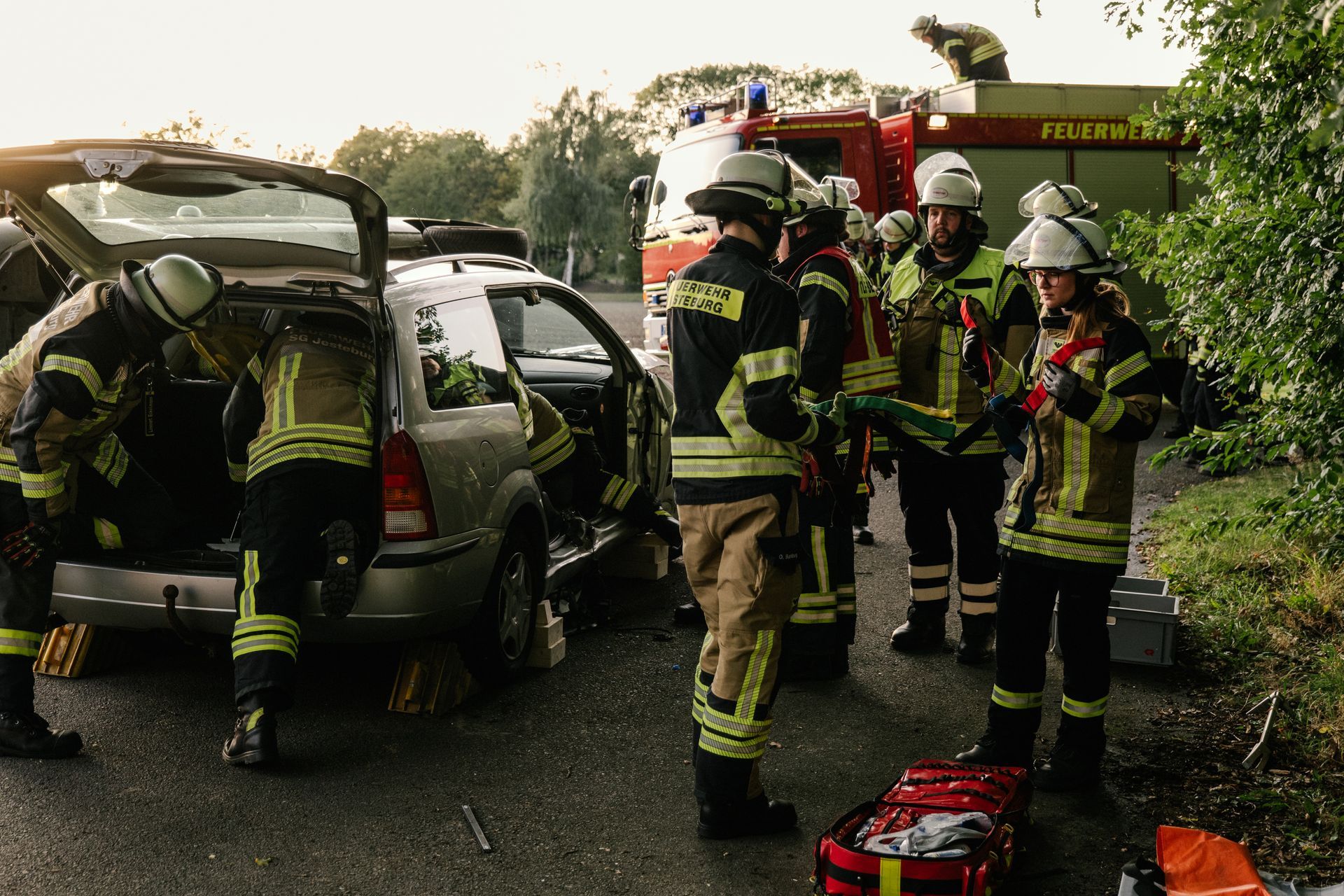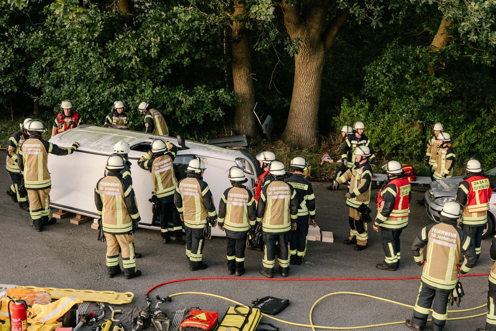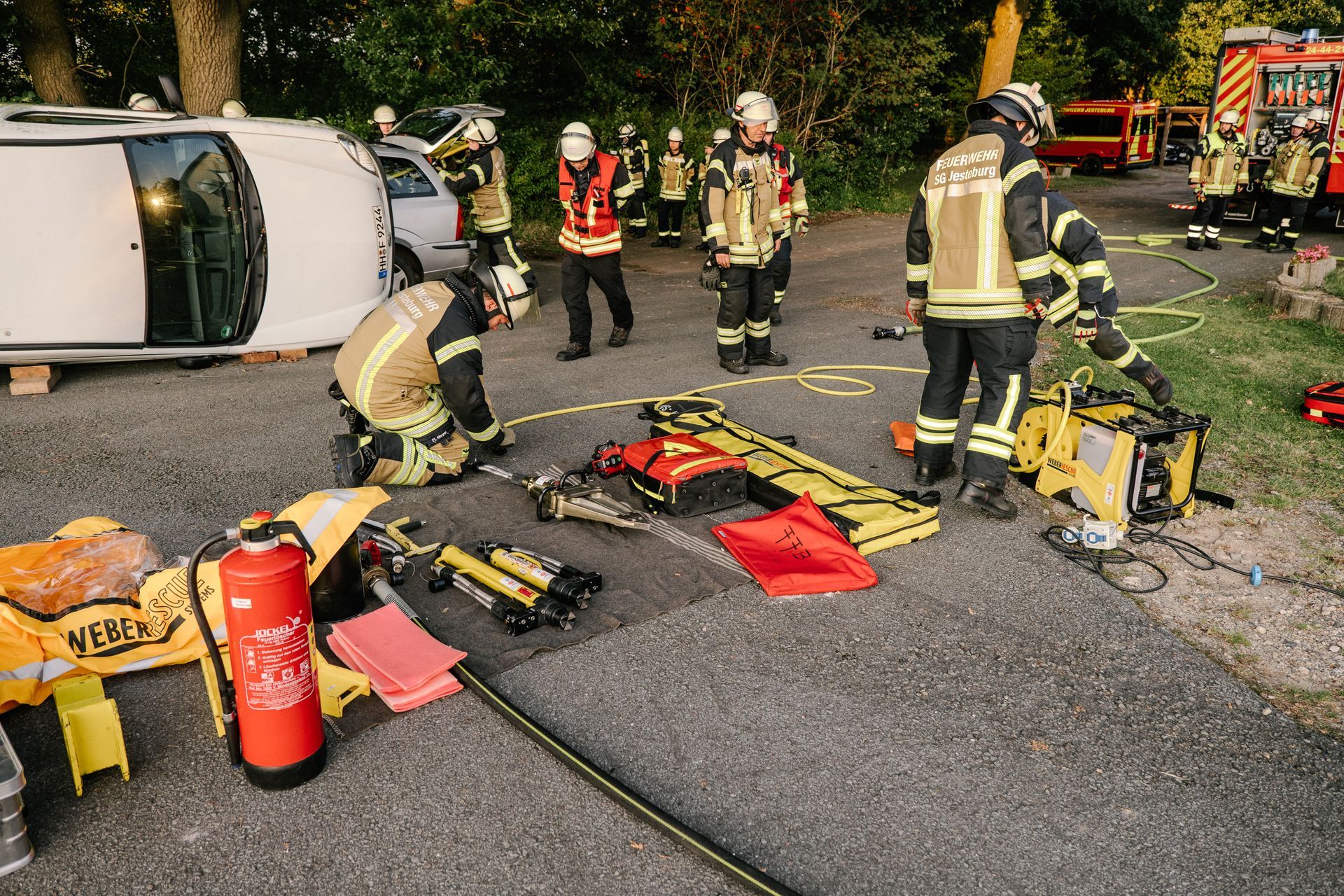 Nachdem diese Grundlagen für die Mannschaft durchgeführt waren, gab es eine Stärkung und die Führung wurde mehr gefordert. Nach einem Verkehrsunfall zweier PKW befand sich einer in Seitenlage. Vier Personen waren verletzt. Neben der technischen Rettung war die Ordnung des Raumes zentrales Element der Übung. Unter Leitung des Gemeindebrandmeisters konnte auch diese Übung erfolgreich absolviert werden. Im Anschluss bestand noch die Möglichkeit die PKW unter Anleitung der eingesetzten Gruppenführer weiter fachmännisch zu zerlegen.